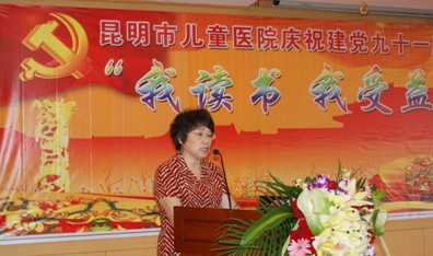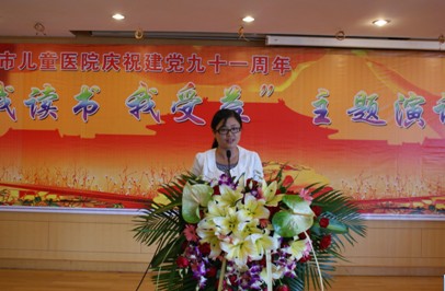 党委书记胡颂云在大会上作了重要讲话,她回顾了中国共产党91年走过的光辉历程,带领中华民族不断创造辉煌,综合国力不断增强,人民生活水平稳步提高,历史充分证明,没有共产党就没有新中国,没有共产党就没有改革开放取得的辉煌成就,没有共产党就没有中华民族的伟大复兴。去年以来,医院广大共产党员在各项工作中较好地发挥党员的先锋模范带头作用,有效促进了医院的建设和发展,借此欢庆建党91周年之际,举办“我读书、我受益”演讲比赛,旨在全院进一步营造“爱读书、读好书、善读书”的氛围,培养医务人员崇尚阅读、自觉阅读的良好习惯,促进医院文化建设更上一个新的台阶。