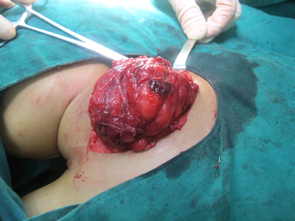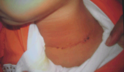 10.8cm大小,质地中等,活动尚可。该肿块临近肺尖及锁骨下动脉,手术风险高,难度极大,经过认真的术前准备,在全麻下为患儿实施了肿块切除术,术后患儿恢复好,治愈出院,病理诊断为纤维脂肪瘤。本例手术的成功,标志着我科在头颈肿瘤手术方面达到了新的高度。