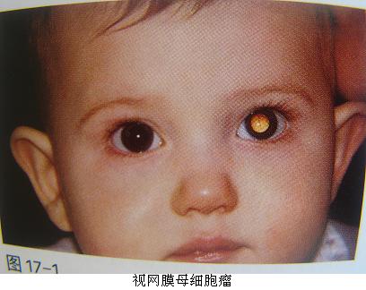 2、视网膜母细胞瘤:是视网膜的胚胎性恶性肿瘤,占儿童眼部肿瘤的首位。此症多在三岁以前发病,75%为单眼患病。初期有约20%因患儿出现患眼斜视,因患者年龄小不能自述患眼视力下降而使病情被忽视,当瘤体长入玻璃体后瞳孔散大呈黄白色反光,才引起家长注意,故有黑朦性“猫眼”之称。如得不到及时治疗,患者的死亡率近100%,故一旦确诊应及时行眼球摘除术,以挽救患者的生命。