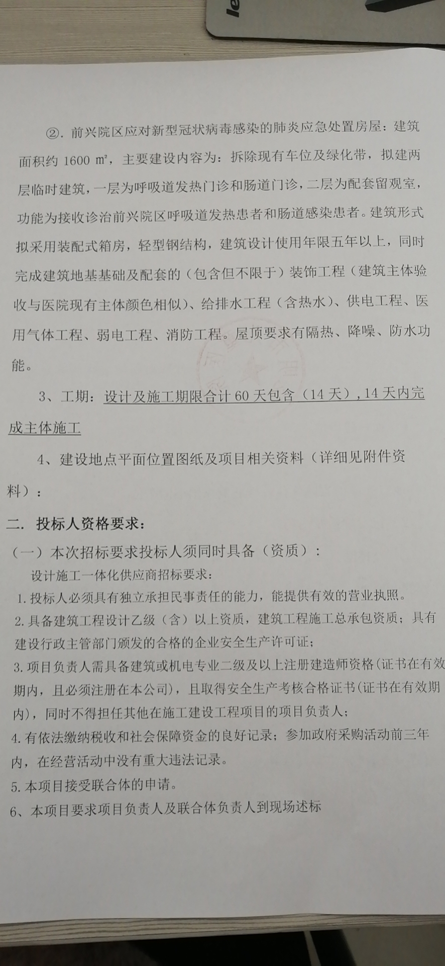 3、工期:设计及施工期限合计60天包含(14天),14天内完成主体施工