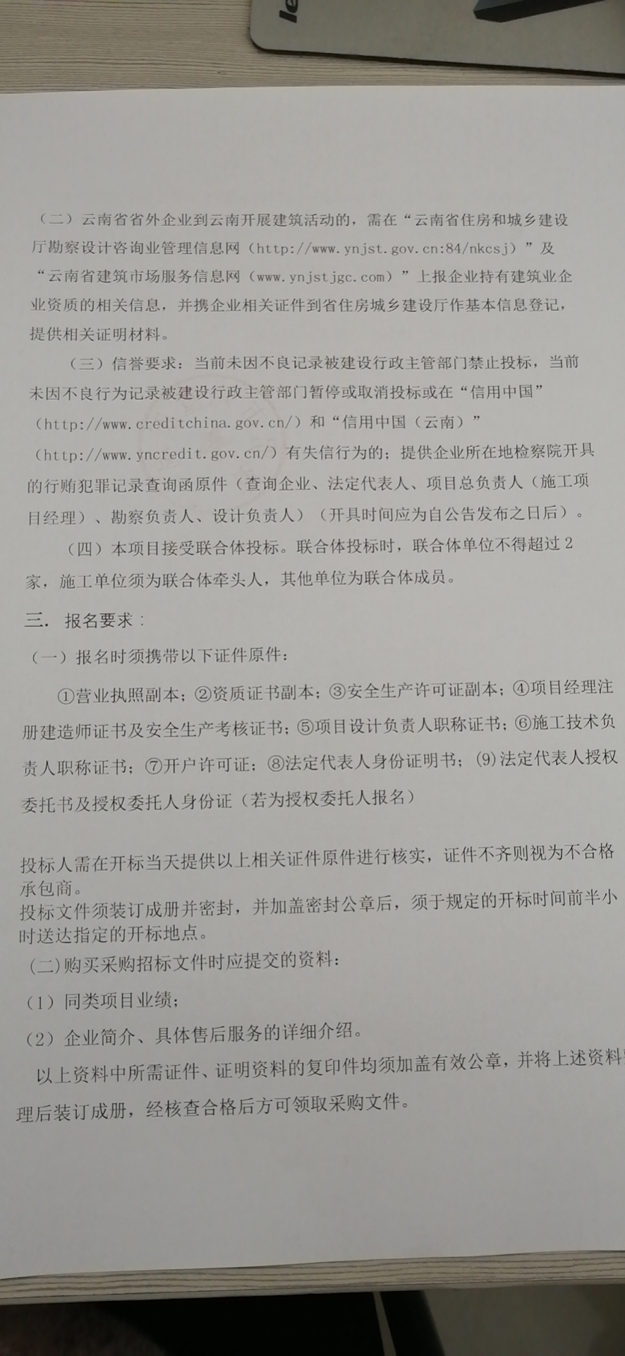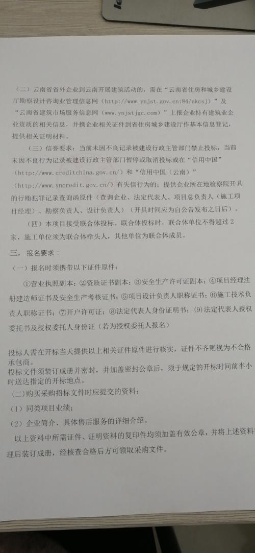 (三)信誉要求:当前未因不良记录被建设行政主管部门禁止投标,当前未因不良行为记录被建设行政主管部门暂停或取消投标或在“信用中国”(//www.creditchina.gov.cn/)和“信用中国(云南)”(//www.yncredit.gov.cn/)有失信行为的;提供企业所在地检察院开具的行贿犯罪记录查询函原件(查询企业、法定代表人、项目总负责人(施工项目经理)、勘察负责人、设计负责人)(开具时间应为自公告发布之日后)。