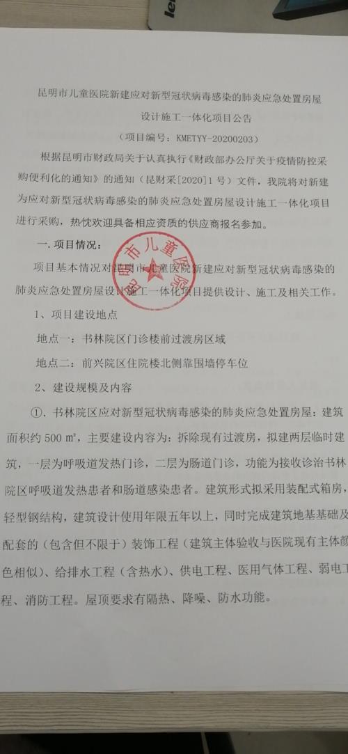 根据昆明市财政局关于认真执行《财政部办公厅关于疫情防控采购便利化的通知》的通知(昆财采[2020]1号)文件,我院将对新建为应对新型冠状病毒感染的肺炎应急处置房屋设计施工一体化项目进行采购,热忱欢迎具备相应资质的供应商报名参加。